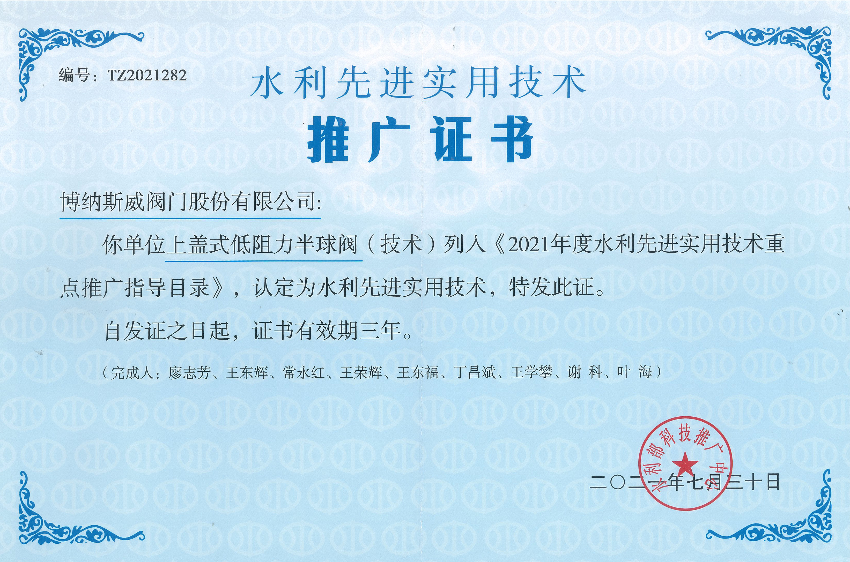 近日,水利部科技推廣中心發布了《2021年水利先進實用技術重點推廣指導目錄》,博納斯威產品 “上蓋式低阻力半球閥”憑借科學的技術原理、先進的技術性能和良好的應用效益等獲得國家部委認可。