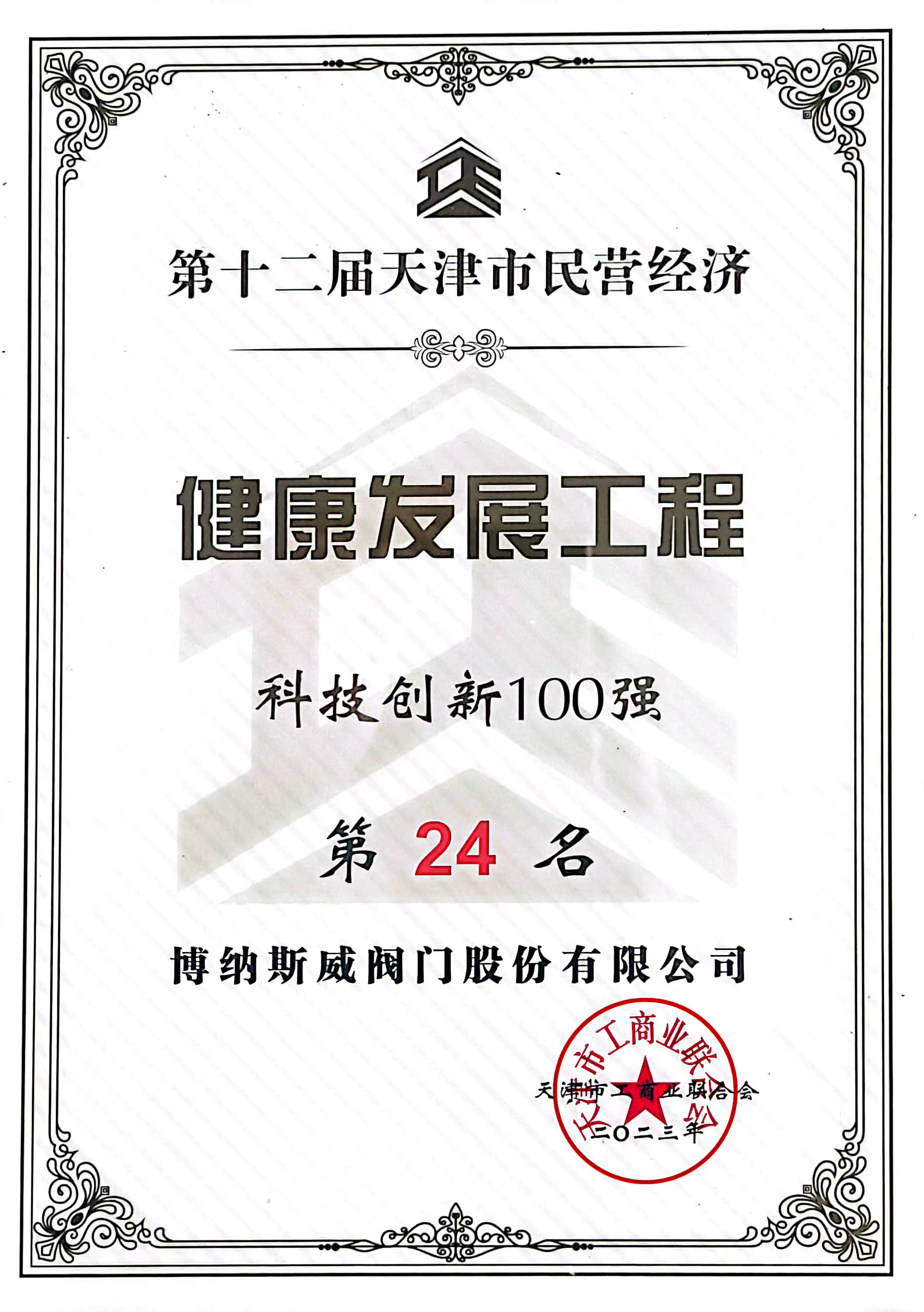 近日,由天津市人民政府、科學技術部、全國工商聯共同主辦的2023中國民營企業投融資洽談會在天津隆重開幕。開幕式期間,舉行了第十二屆天津市民營經濟健康發展工程發布會,共發布五項榜單,博納斯威閥門股份有限公司榮列科技創新百強第24名。