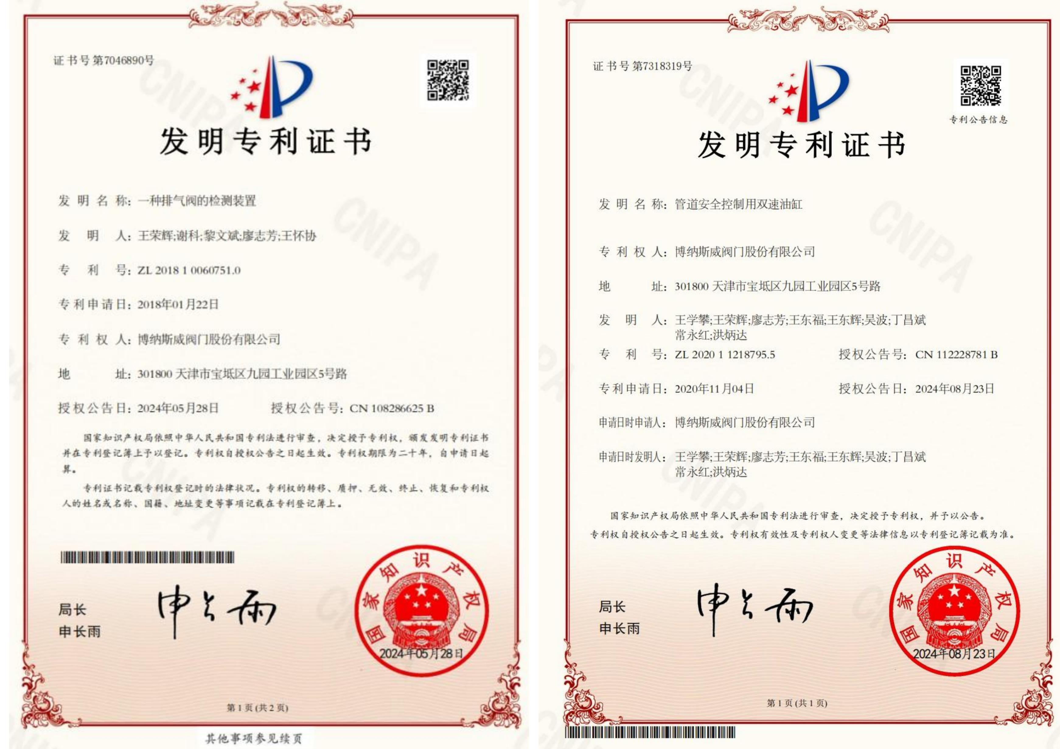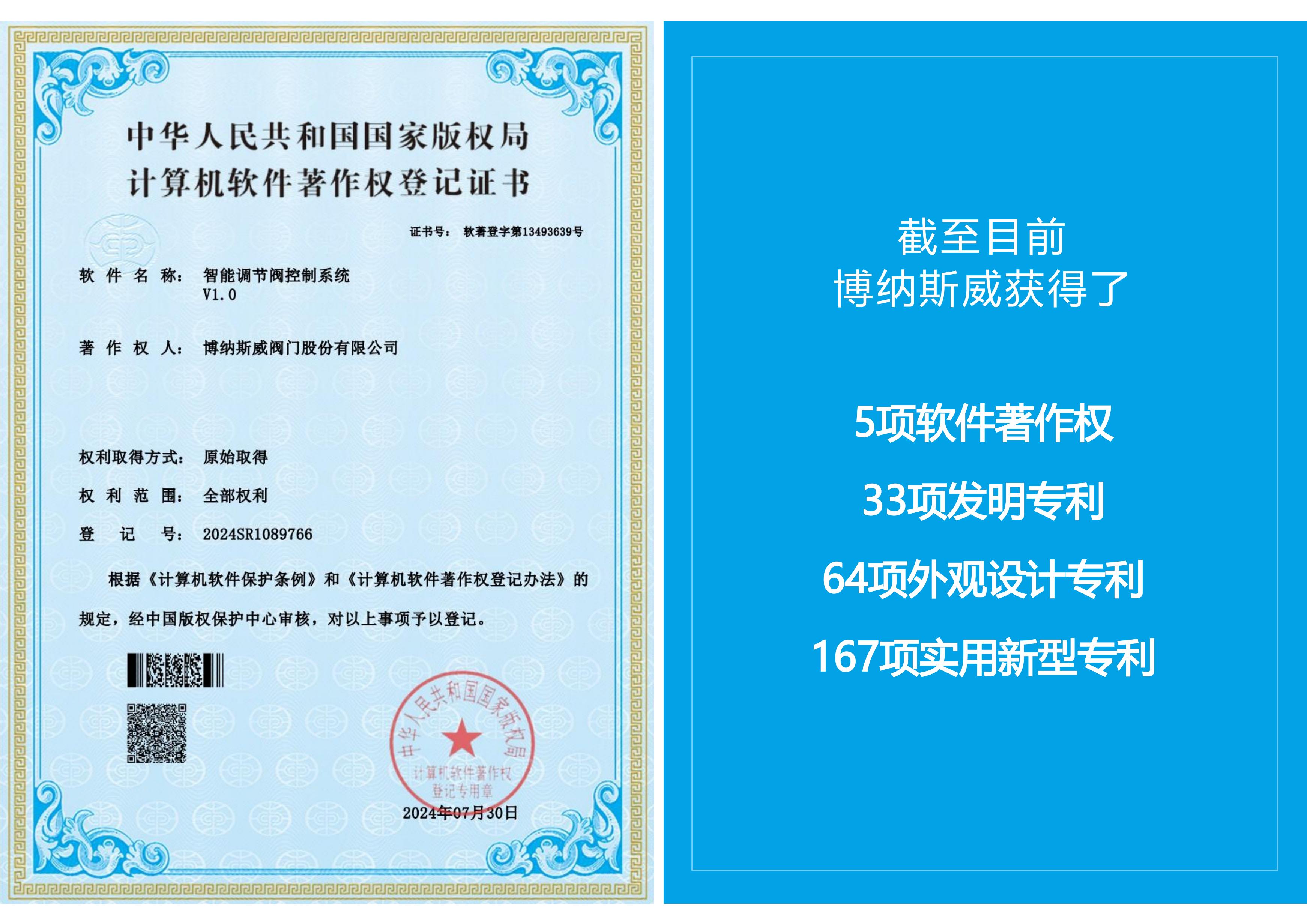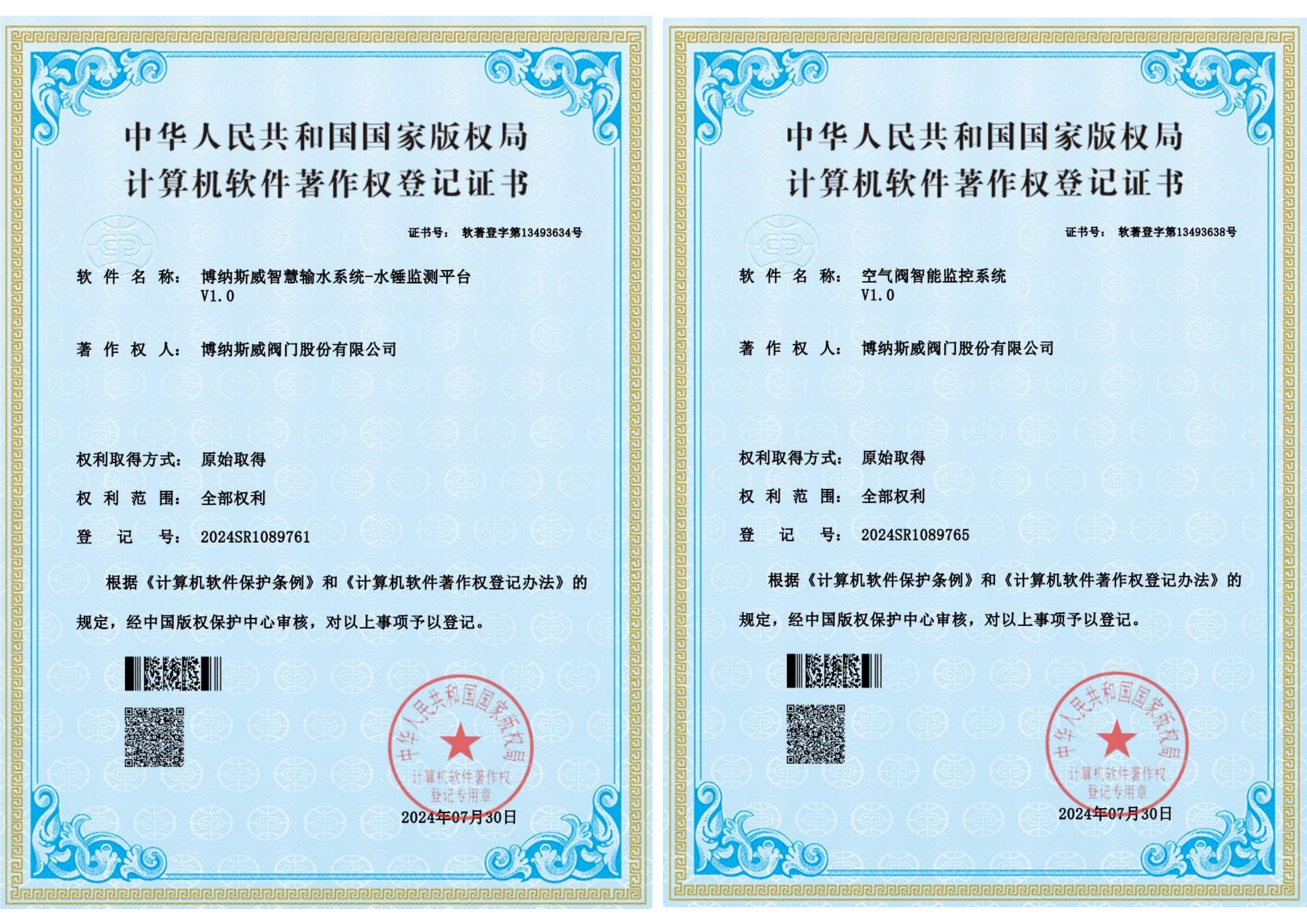 博納斯威智慧輸水系統-數字孿生平臺、博納斯威智慧輸水系統、博納斯威智慧輸水系統-水錘監測平臺、空氣閥智能監控系統、智能調節閥控制系統五項新技術獲得了國家版權局授權軟件著作權。六項發明專利包括一種用于測量閥門進氣量的檢測裝置、一種排氣閥的檢測裝置、對沖消能軸流式環塞閥、一種液壓傳動雙向密封軸流式截止閥、管道安全控制用雙速油缸以及爆管保護安全裝置。