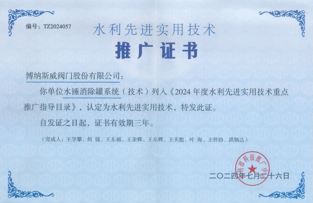 近日,水利部科技推廣中心發布了《2024年度水利先進實用技術重點推廣指導目錄》,我公司申報的新型技術“水錘消除罐系統”,憑借科學的技術原理、先進的技術性能和良好的應用效益,通過水利部專家嚴格篩選,成功入選該目錄。